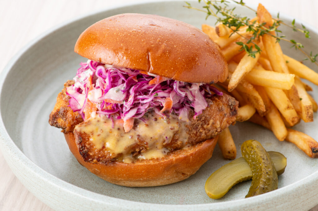 そして、先述のクリスピーチキンをバーガーでアレンジしたのが、終日提供の「クリスピーフライドチキンバーガー」。軽くトーストしたふんわりバンズに、ハニーマスタード風味のクリスピーチキンとバターミルクドレッシングで和えた人参、赤キャベツのコールスローを大胆にサンドしました。豪快さとスタイリッシュが一皿に凝縮した、ハイセンスバーガーとなっています。