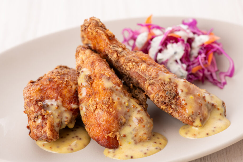 ディナータイム対象の「クリスピーフライドチキン バターミルクコールスロー」は、カリッとジューシーに揚げたチキンを、ハニーマスタードでお楽しみいただきます。サイドにはバターミルクドレッシングで和えた人参、赤キャベツのコールスローを付け合わせています。ビールやワインといったお酒との相性も抜群、アペタイザー、おつまみにぜひおすすめしたいメニューです。