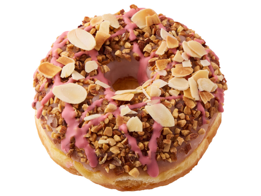 ホワイトアイシングをコーティングし、細かく砕いたアーモンド、ストロベリーチョコレート、スライスアーモンドをトッピングしました。甘酸っぱいストロベリーチョコレートにアーモンドの風味と食感を組み合わせたイーストドーナツです。