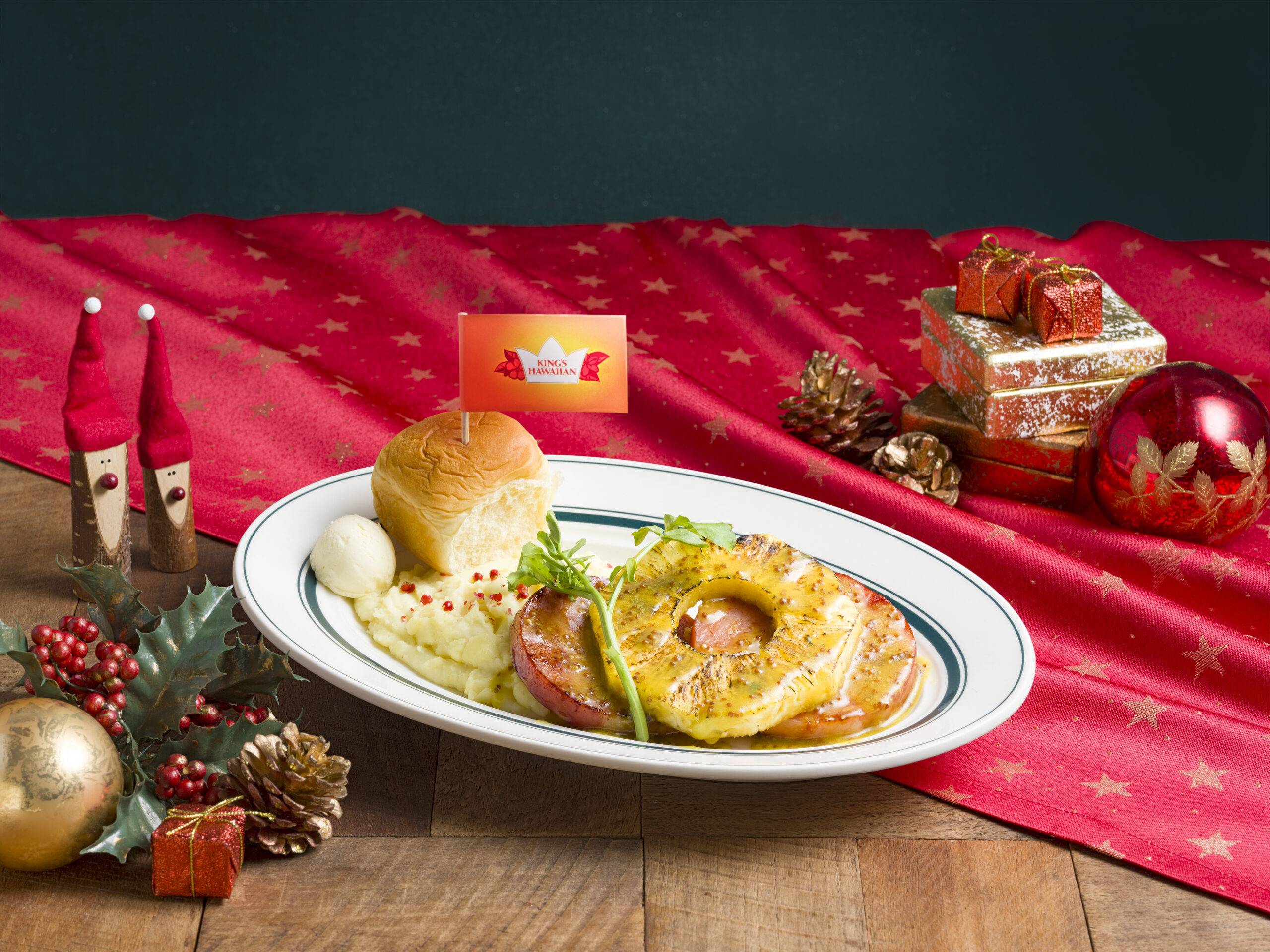ハワイのホリデーシーズンメニューの1つとして登場する『クリスマス ハワイアン ハムステーキ with KING'S HAWAIIAN』は、こんがり焼いた厚切りのハムに⽢酸っぱいパイナップル、ハニーマスタードソースをかけたハワイのホリデーシーズンに親しまれているメニューです。⼤⼈気の「KING'S HAWAIIAN」オリジナルハワイアンスウィートロールとお楽しみください。