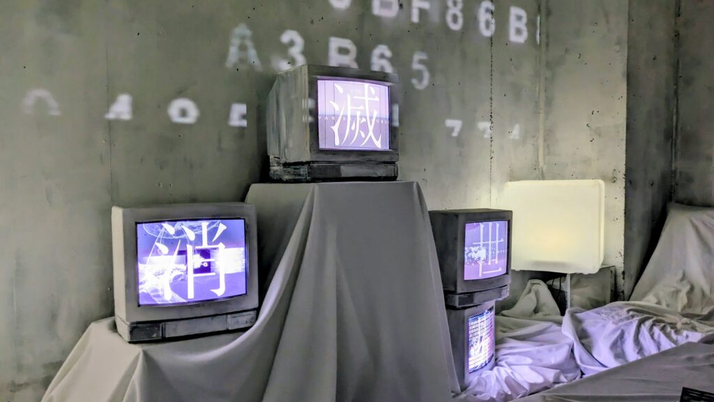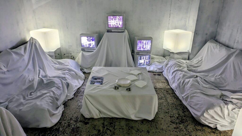 店内はこれまで主にイベントスペースとしても活用されCAFE:MONOCHROME02という別形態でも営業していた空間を今回のコラボカフェの為に改装して、壁やブラウン管テレビ、ソファやテーブルと何から何まで純白でコーティングされた特別仕様に様変わりしています。元々の装飾も川村監督自身が配線含めてこだわっており、今回も映画の世界観を意識して細部まで徹底した装飾にアレンジを加えています。