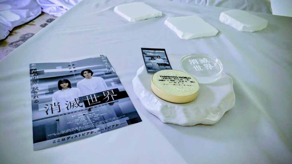 映画消滅世界では、上映に合わせて新ポスタービジュアル5種が新たにお披露目となり、下のビジュアルは映画で登場する重要な1シーン。白さが際立つ楽園都市エデンで主役の2人があえて黒い服をきて神妙な面持ちで何かこぼしている場面…是非、続きは映画館で確認してください!