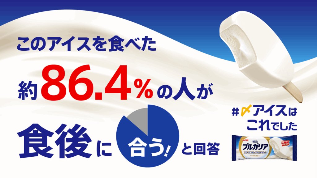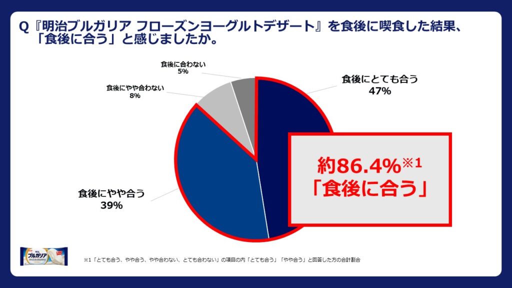 また、株式会社 明治が一般社団法人日本味覚協会の協力のもと、20 代~50 代の男女 118 名を対象に「食後に合うアイス」に関する調査を実施したところ、約 86.4%※1の人が「明治ブルガリア フローズンヨーグルトデザート」を食後※2に合うアイスだと回答しました。喫食者からは「あらゆる類の食事の後でも、口直し的な位置付けとして幅広く受け入れられる味だと思う」「さっぱり感と濃厚さの両方を感じられて合う」「クリーミーだけどさっぱりとした酸味があり、食後に食べるアイスとして満足感がある」といった声が寄せられました。秋の味覚を楽しんだ後の食後にぴったりの“〆アイスの新定番”です。