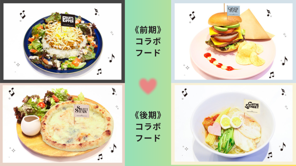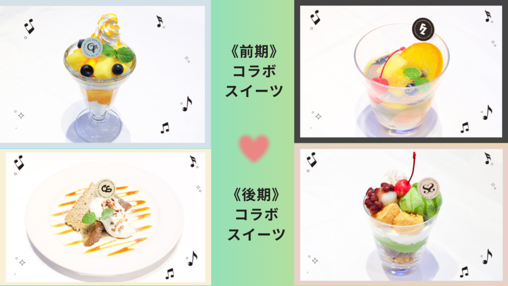 ※前期と後期でメニューのラインナップ(フード、スイーツ、ドリンク)とコラボメニューの注文で貰える特典のデザインが異なります。