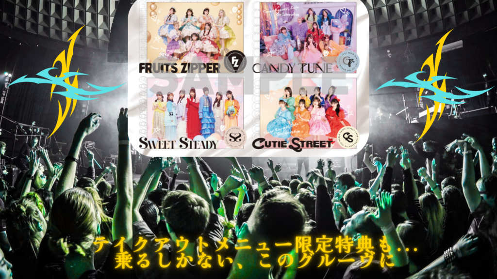 TOWER RECORDS CAFE では、KAWAII LAB.発足4 周年とベストアルバムのリリースを記念して、FRUITS ZIPPER、CANDY TUNE、SWEET STEADY、CUTIE STREET の4 組とのコラボカフェを開催します。昨年の日本レコード大賞で優秀作品賞受賞のFRUITS ZIPPER、昨年のNHK紅白歌合戦で紅組トップバッターを飾ったCANDY TUNEといった今を時めく人気アイドルグループとタワーレコードカフェの夢のスペシャルコラボレーションですが、今回のコラボカフェでは「ふるっぱーポンポンチ」や「美味しさ倍倍ハンバーガー!」など楽曲やグループカラーをイメージしたコラボメニューを、前期と後期で一部内容を入れ変えて展開します。時期によって異なる特別ラインナップのメニューに加え、限定コラボグッズも用意されるので、ファンの方、お時間ある方のある方も是非コラボカフェに足を運んで、「原宿から世界へ」をコンセプトに世界の最前線で活躍するメンバーの熱量をコラボカフェでも感じて欲しいです。