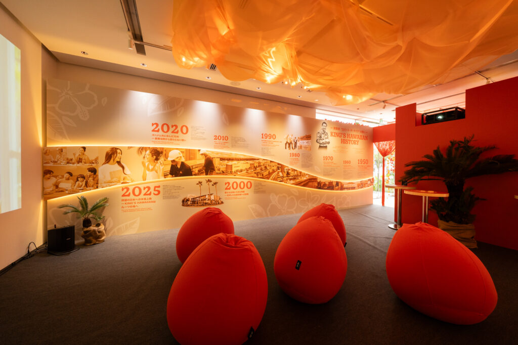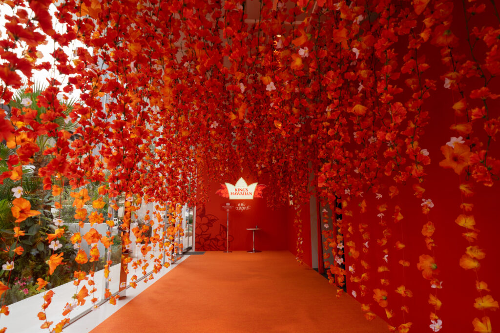 13時からはメディア関係者向けに内覧ツアーや看板商品の試食会が行われ、園内は単なる催事スペースにとどまらずハワイを感じる本格的な趣向を凝らしたミュージアムの様な造りで、ブランドカラーのオレンジが鮮やかに彩られ、KING’S HAWAIIANのヒストリーを感じることが出来たり、多彩なラインナップのオリジナルグッズに100円でチャレンジ出来るクレーンゲームなど、エンターテインメントが詰まったPOP UPに関係者からも歓声が上がっていたとのことです。